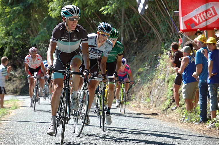 | Il gruppo maglia gialla: da sx Jelle Vanendert (maglia a Poins), Andy Schleck, Alberto Contador nell'attimo in cui scatta e non verrà più ripreso dal gruppo, Pierre Rolland e Damiano Cunego. |